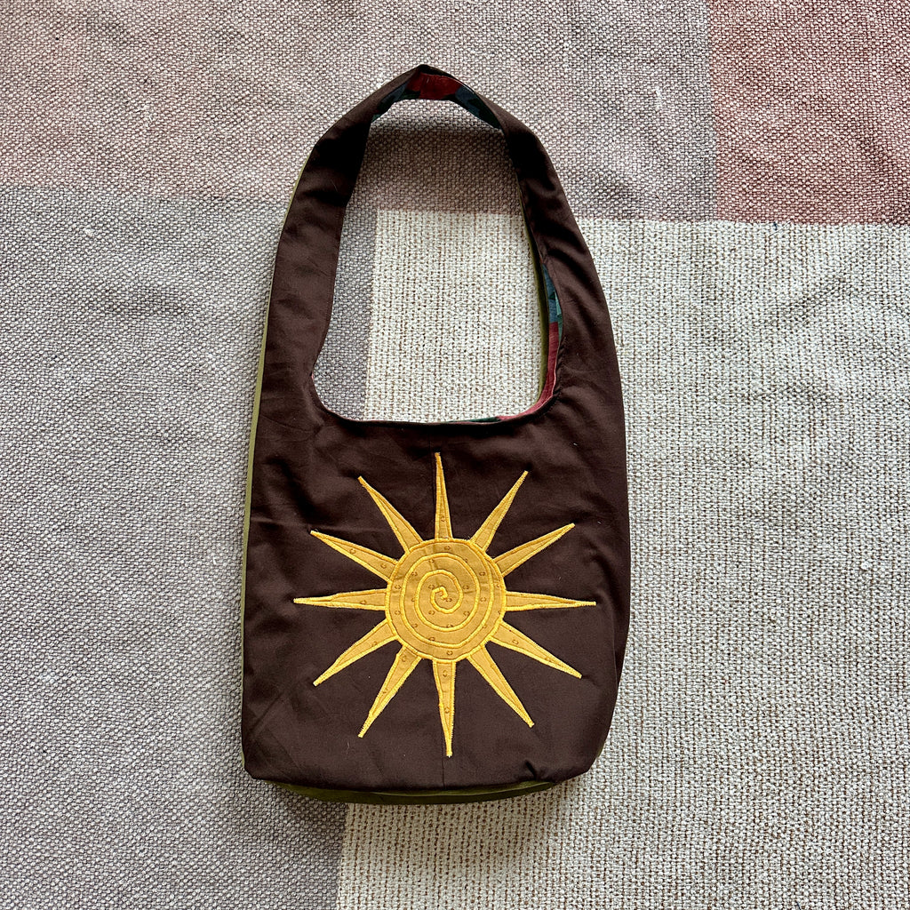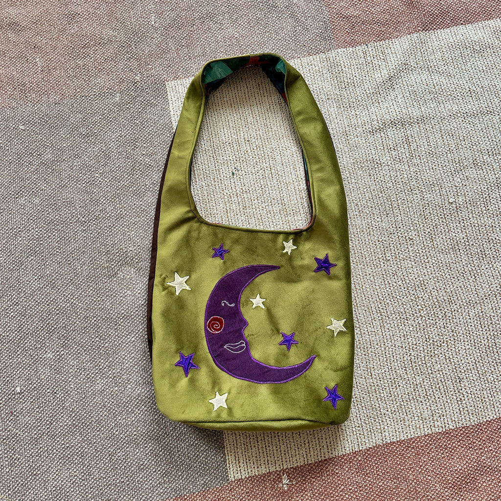Dreamy two sided shoulder bag in brown cotton and moss green velvet. Featuring embroidered sun on one side and moon and stars the other. This baby is lined with an inside pocket. The perfect whimsigoth bag for carrying around all your witchy essentials!