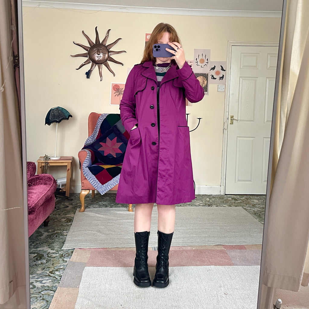Cute lil vintage coat in mulberry magenta pink. Features button front, pockets and cute collar. Made from a lovely cotton twill and fully lined šš Size 14 but fits more like a 12, can fit smaller more oversized, Iām size 10 for ref šš