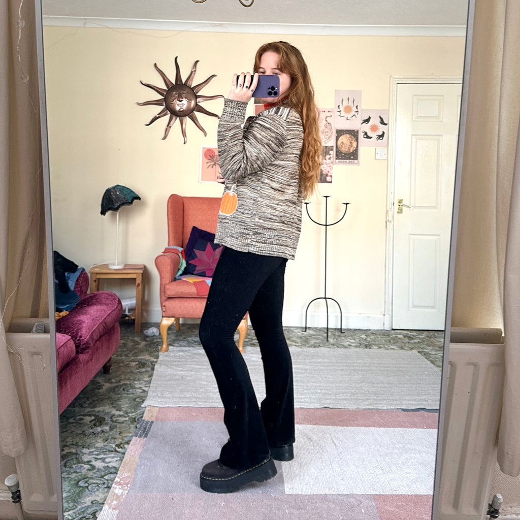 Cute vintage cardigan in earthy beige and brown knit. Reworked by me with embroidered stars, gourd and pumpkin. Features button front and relaxed fit. Made from a soft poly acrylic knit. 🌙🌙 Size L - will fit size 8-14 best. I’m size 10 for reference.🌙🌙