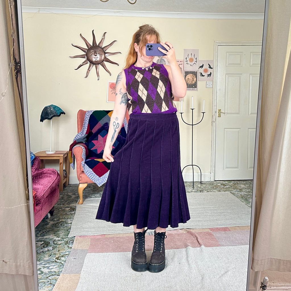 Gorgeous midi skirt in purple corduroy. Features side zip and pleated bottom. Wear with a pretty top and your fave chunky shoes for whimsical vibes. ✨✨ Waist: 32" Length: 32" - Will fit size 12 best or smaller belted/low waisted. I'm size 10 and 5'5 for ref ✨✨